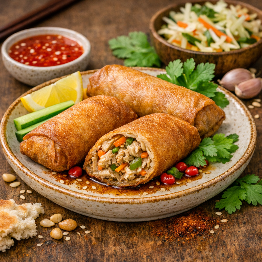 Krokant gebakken loempia’s gevuld met gekruide kip, wortel en lente-ui. Warm geserveerd met zoetzure saus of sojasaus als een smaakvolle oosterse starter.