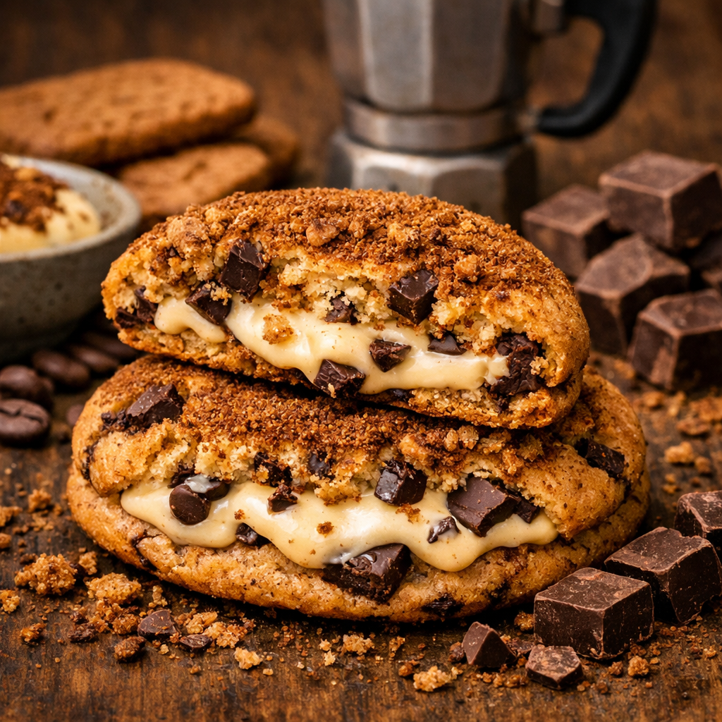 Een romige tiramisu‑cookie met speculooskruiden en stukjes pure chocolade. De perfecte combinatie van koffie‑aroma, warme speculaaskruiden en rijke chocoladesmaak — een onweerstaanbare traktatie voor liefhebbers van luxe desserts.